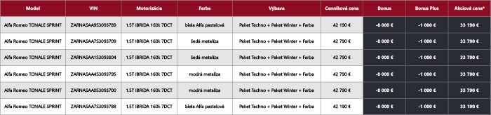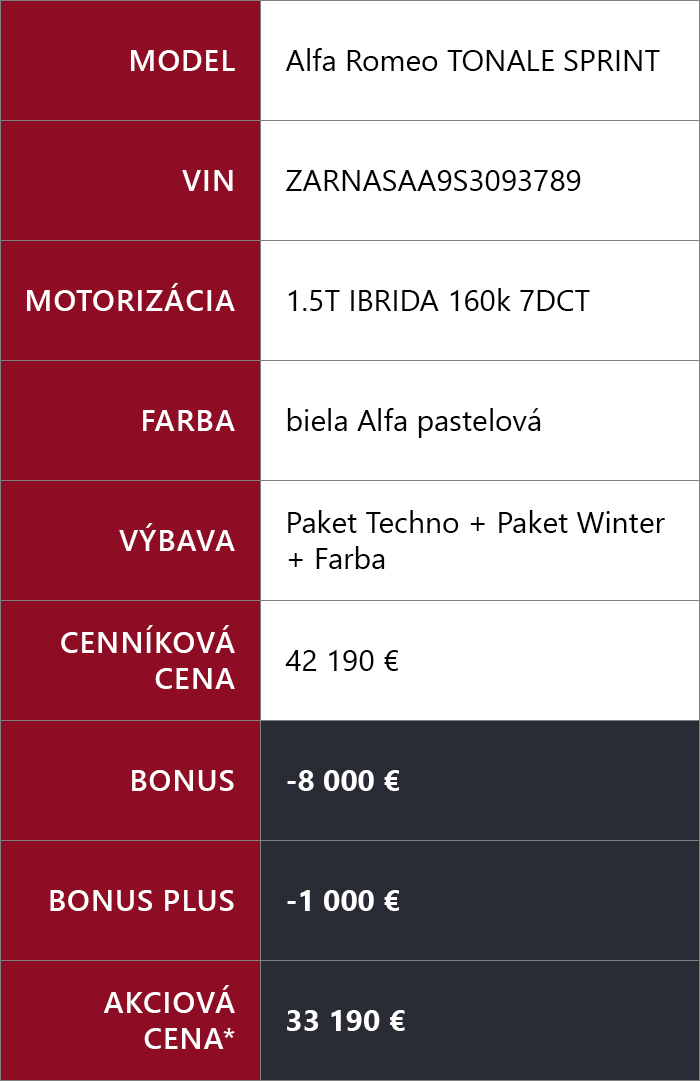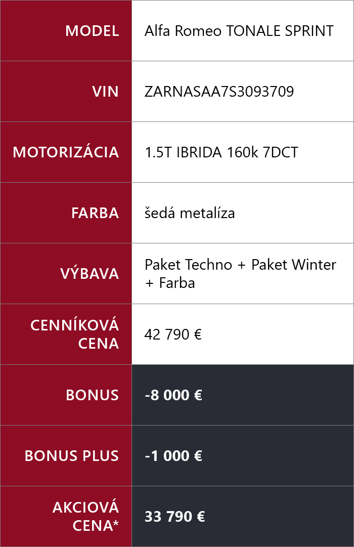 Nezmeškajte jedinečnú príležitosť zažiť dokonalé spojenie emócie, štýlu a talianskeho dizajnu. Len teraz môžete získať posledné skladové vozidlá Alfa Romeo Tonale Sprint+ s bonusom až 9 000 €*. Využite ponuku Bonus Plus prostredníctvom značkového financovania ALFA ROMEO Finance a doprajte si jazdný zážitok, ktorý dokáže priniesť iba Alfa Romeo. Každé vozidlo navyše získate so zárukou na 4 roky/100 000 km zadarmo, pre ešte väčšiu pohodu na cestách.
